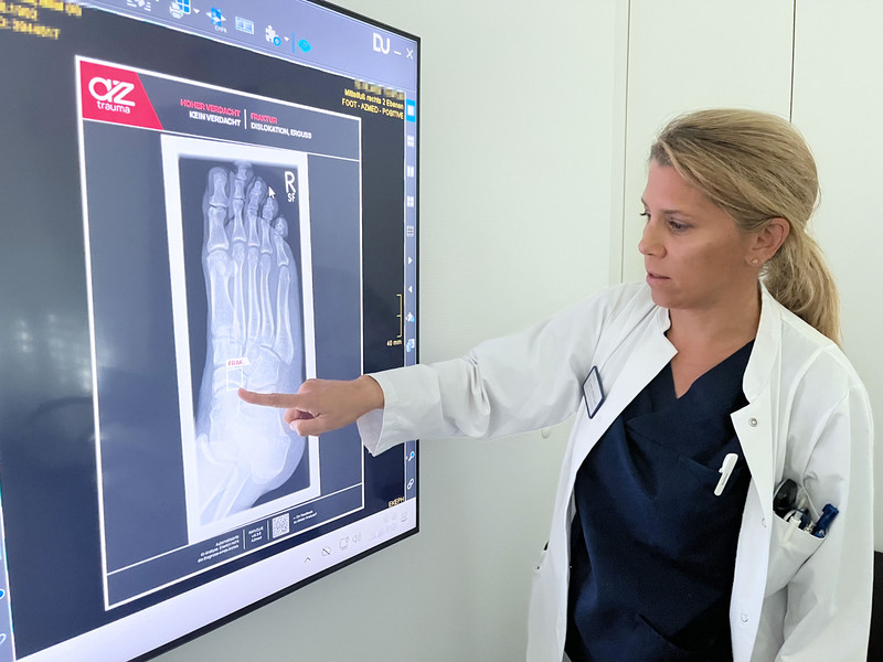 Seit März 2025 ist das KI-Programm „AZmed“ im Einsatz: „Die KI untersucht Röntgenbilder und gibt uns eine Einschätzung, ob eine Fraktur vorliegen könnte oder nicht“, erklärt die Funktionsoberärztin der chirurgischen Ambulanz der Klinik für Unfallchirurgie, Orthopädie und Sportmedizin. „Außerdem kann das Programm Flüssigkeiten im Gewebe oder Gelenken wie Ergüsse oder Infiltrate erkennen. Auch einen Pneumothorax – ein kollabieren der Lunge - erkennt und markiert die KI.“ Fälle, die tagtäglich in einer Notaufnahme behandelt werden müssen: „Beispielsweise röntgen wir Tag und Nacht, ein Radiologe ist aber nicht immer 24 Stunden im Dienst, um Bilder auszuwerten.“ Besonders im hektischen Alltag kann die KI helfen, dass besonders kleine und unauffällige Frakturen schneller festgestellt werden. Dies gehe sehr einfach: „Um eine Fraktur zu erkennen oder auszuschließen, werden die Patient:innen in der Radiologie geröntgt. Die entstehenden Bilder können wir dann mit wenigen Klicks direkt aus unserem Betrachtungsprogramm anonymisiert zu ‚AZmed‘ senden. Die KI analysiert dann die Röntgenbilder und gibt uns dann im Rahmen einer Rückübermittlung eine Einschätzung.“